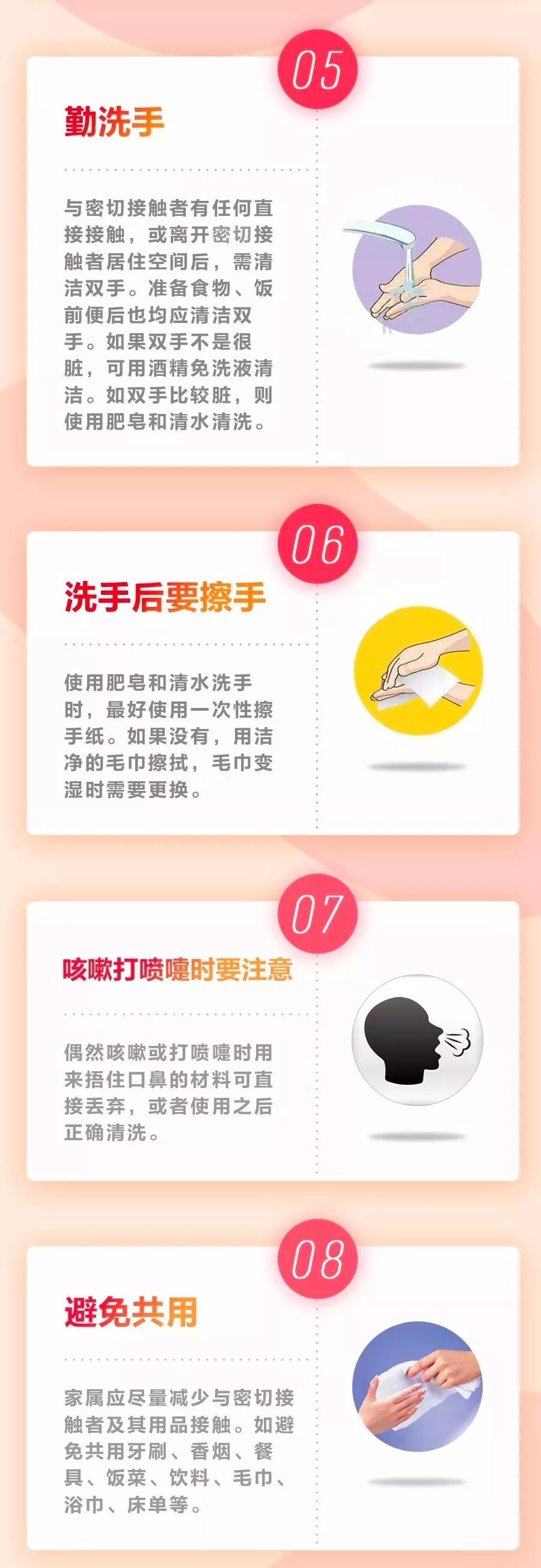 新型冠状病毒感染的肺炎确诊病例的密切接触者,应从和病人接触的最后一天起采取医学观察14天。在家中观察期间,需与医学观察人员保持联系,并需要了解病情观察和护理要点,掌握家庭预防的洗手、通风、防护和消毒措施。