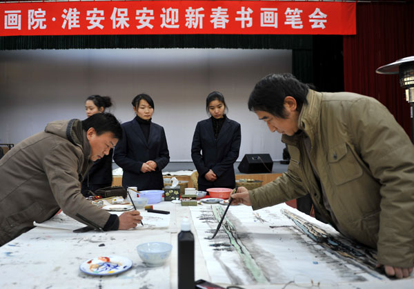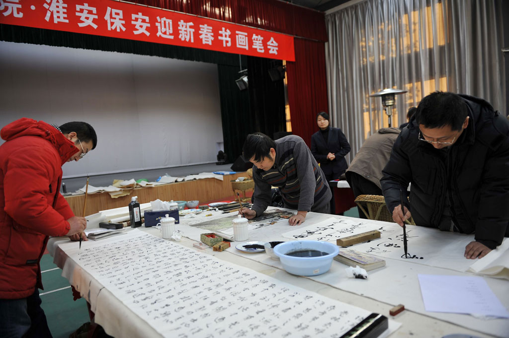 元月16日下午,由淮安书画院和总公司联合举办的“迎新春书画笔会”活动在公司活动中心举行。公司总经理娄伯翱、副总经理王克、徐文刚和各部门负责人莅临活动现场,部分保安队伍和押运队伍中的书画爱好者到现场观摩学习。会上,书画们齐集一堂,创作了一幅幅书画精品,彰显了保安文化特色,赢得了在场观摩者们的赞赏与好评。