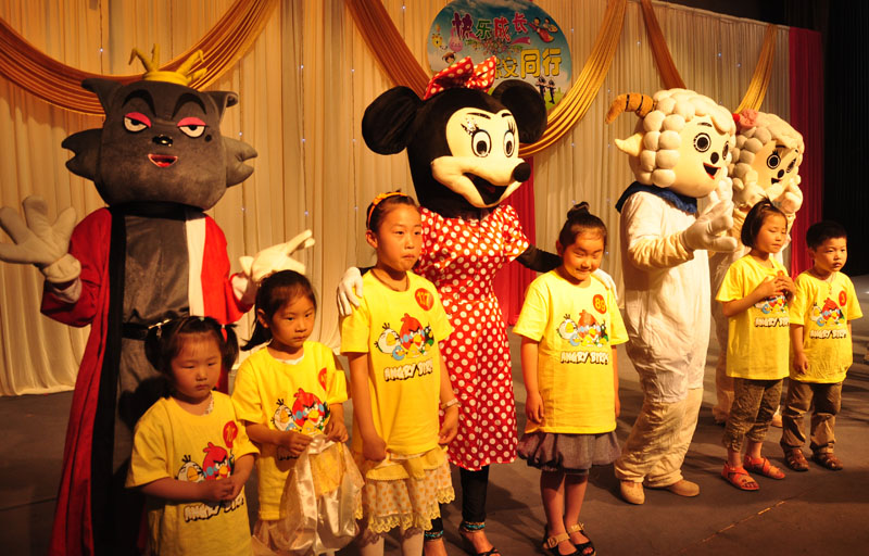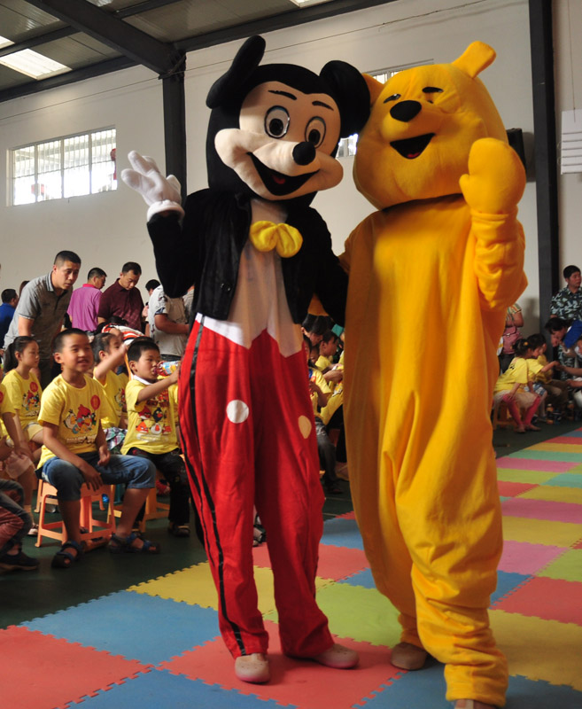 下午两点,活动中心内,播放着一首首儿童歌曲,卡通人物喜羊羊、美羊羊、红太郎、灰太狼、维尼小熊等在场内和孩子们愉快的做着小游戏。每个到场的孩子凭着入场券在场内领取了一件黄色的卡通T恤衫,还有食品和饮料。