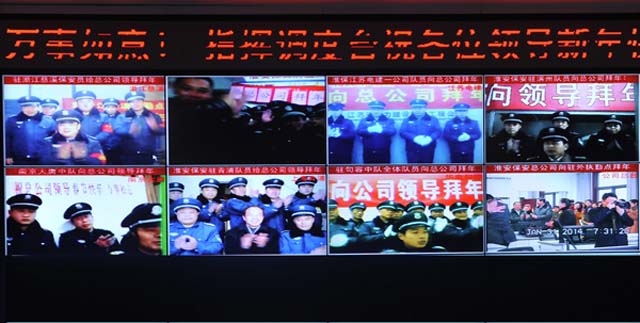 2014年元月31日大年初一早晨7时28分,公司总经理娄伯翱、副总经理王克、徐文刚以及公司党总支委员、公司各部负责人一起慰问了执行任务的武装押运员,娄伯翱总经理代表党总支向大家拜年并致以节日的问候和祝福。随后,公司领导来到公司指挥调度中心,通过互联网视频连线,代表总公司党总支慰问了驻外分公司驻浙江慈溪、上海青清、山东滨州、南京大唐、镇江等地驻外保安队伍,向他们致以新春的祝福!