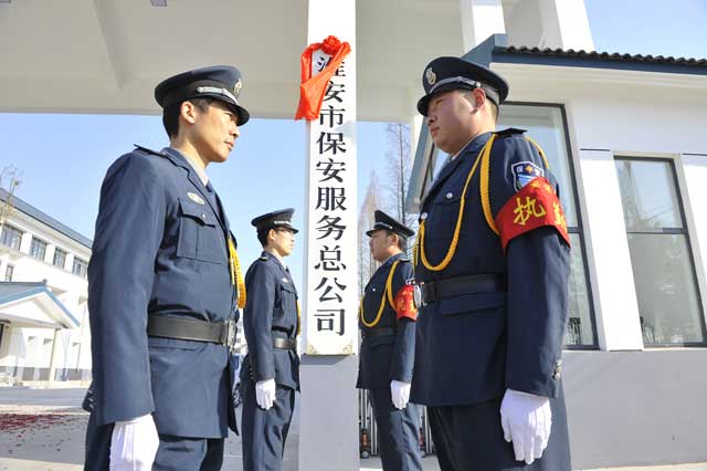 虽然室外气温格外寒冷,但这里却充满了春天的气息。上午9时50分,4名礼仪保安抬着一块披着红绸的标牌, 迈着整齐的步伐走向公司大门,9时58分,江苏省淮安市保安服务总公司标牌缓缓地、平稳地挂了起来,现场响起阵阵鞭炮声和热烈的掌声,大家共同为总公司新址挂牌而欢欣鼓舞。