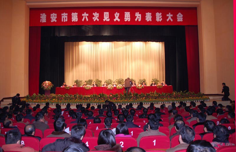 12月24日上午,我市在淮安人民大会堂召开第六次见义勇为表彰大会,对全市58名见义勇为先进个人进行表彰。会议由市委常委、秘书长、常务副市长陈洪玉主持,副市长、公安局长倪兴余宣读了《市政府关于表彰见义勇为先进个人的通报》,市见义勇为基金会理事长李继尧宣读了《市见义勇为基金会关于给唐子年等同志颁发奖金和抚恤金的决定》,两名见义勇为先进个人代表在会上发言,市委书记刘永忠同志到会并作重要讲话。市政协主席王维凯,市人大代理主任范学恕,市局副局长徐乾,市局党委委员、政治部主任王国庆及各县(区)委、政府、市经济开发区管委会分管负责人,公安(分)局局长、政委,市法院、检察院分管负责人;市委各部委办、市各委办局、市各直属单位、部省属驻淮单位、市各大中专院校分管负责人,部分大中专院校学生以及市各新闻单位的记者共1500人参加了会议。