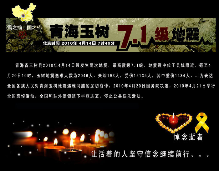 新华社4月20日电 为表达全国各族人民对青海玉树地震遇难同胞的深切哀悼,国务院决定,2010年4月21日举行全国哀悼活动,全国和驻外使领馆下半旗志哀,停止公共娱乐活动。