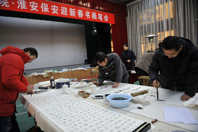 为表达书画艺术界人士对保安队伍的关爱,元月16日,淮安书画院书画家走进市保安公司进行新春慰问,书画家们挥毫泼墨,作品寓意深刻,彰显了保安文化特色,为保安员工奉献了一份艺术大餐。