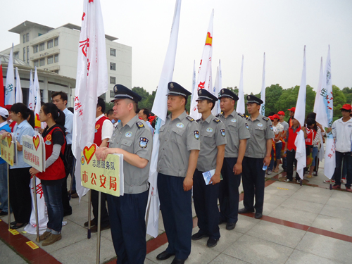 早上8:30左右 , 队员们统一制服,带上队旗和队牌,在师范学院王营校区生物科学馆前广场前参加环保知识的宣传活动。队员们纷纷表示,保护环境,与我们的生活息息相关,从身边小事做起,将切实落实到保安的实际工作中去。作为青年志愿者,将呼吁身边更多的人用实际行动,共同为保护洪泽湖、保护环境而尽心尽力,为努力营造一个优美的人居环境而努力。