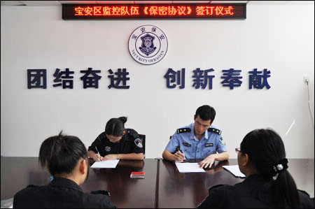 为进一步提高监控员保密意识,落实涉密人员保密责任,确保公安工作秘密安全,9月9日下午,广东省深圳市宝安区保安服务公司信息工程部组织全体监控队员在会议室进行了保密协议签订仪式。信息工程部经理张洹分别与每名监控队员签订了《保密协议书》,要求监控员仔细阅读和领会《保密协议书》的内容,严格遵守保密的内容和范围、保密义务、保密期限和违约责任。