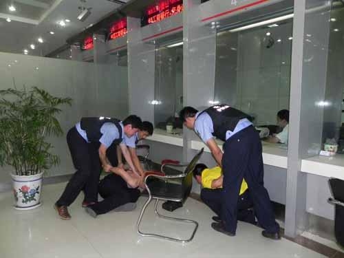 为进一步做好押运工作,6月30日,德州市在市区某工商银行现场开展反抢劫模拟演练。按照方案部署,两名押运队员扮演的犯罪分子来到业务窗口说要取10万现金,随后拿出事先准备好的仿真***和炸药包逼工作人员把钱交出来,随后三名押运队员上前把“犯罪分子”捉拿归案。此时现场响起热烈的掌声,演练圆满结束。