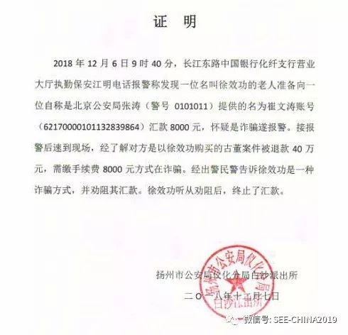 该老年客户说是一个自称北京市公安局叫张涛的人让他汇8000元过去,该笔费用是打假奖励的公证费,支付完该笔公证费后半小时北京公安局即会给其打假奖励27.8万元。江明立即判断是一起典型的电信诈骗,随即对其进行了劝说,是电信诈骗,不要汇款。