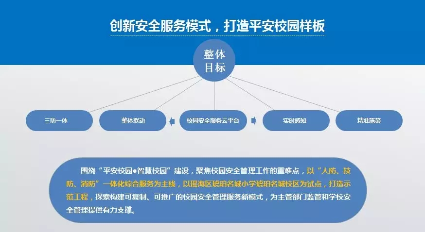 据了解,该系统包括安全基础信息、人力防范服务、技防防范系统、消防设备监测、培训演练信息、事件处置记录六个系统,充分聚焦校园安全工作,深度应用科技信息,实现校园安全监控全覆盖,同时,该示范工程具有可复制,可推广的特点,为学校防护体系解决了科技支撑作用不明显,责任主体分散,安防应用契合度低的缺陷,是主管部门监管和学校安全管理的重要支撑。