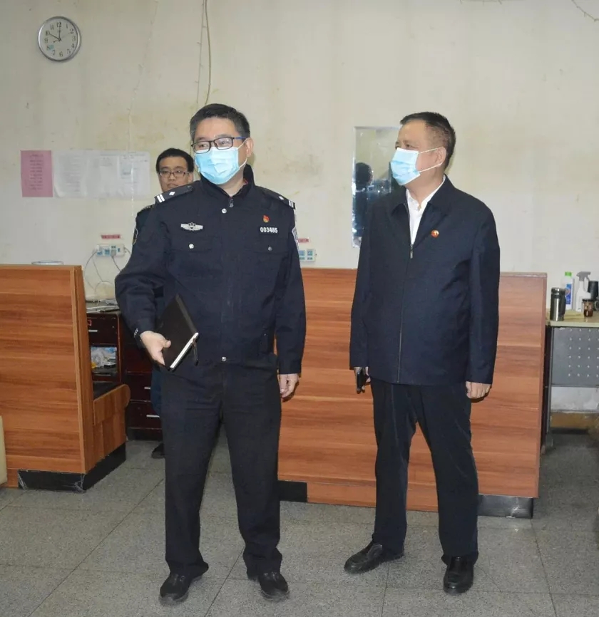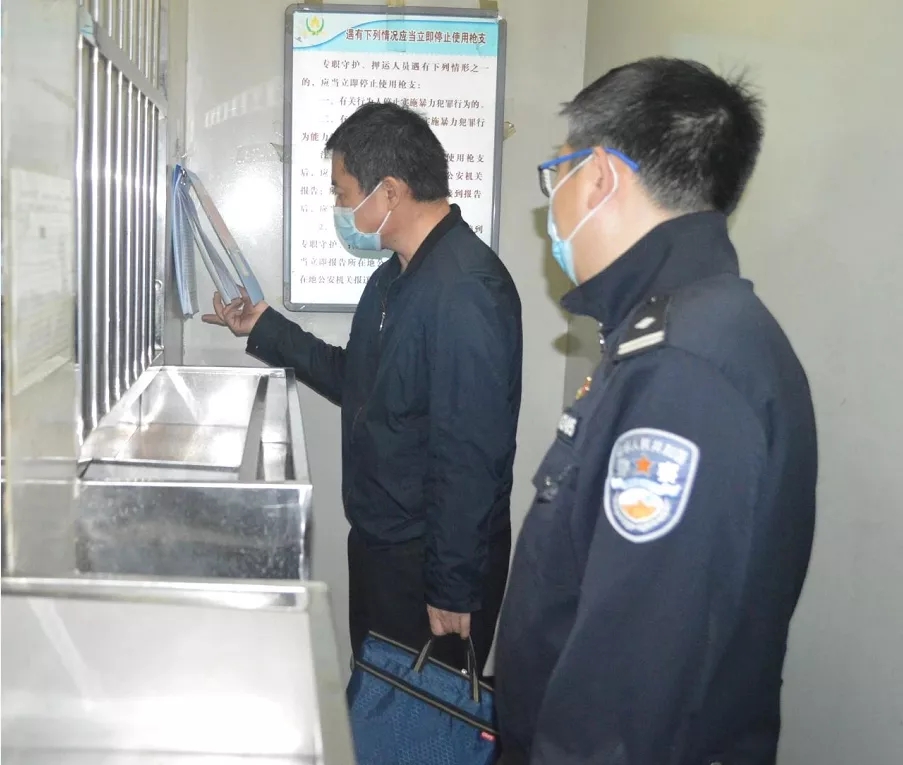4月5日,北京市公安局治安管理总队危管支队支队长关四喜在中队长张继伟陪同下,到北京振远护卫中心第十二支队花园路基地检查指导疫情防控期间枪弹管理工作。