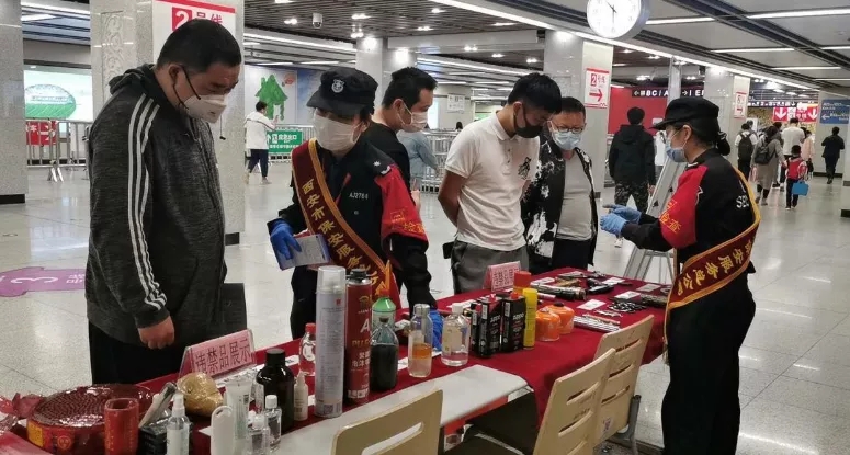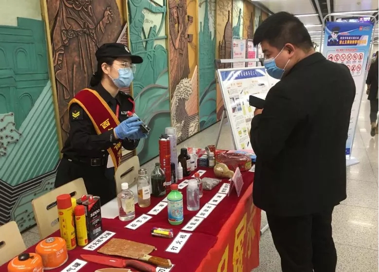 其中,宣传展板通过图文并茂的方式重点展示了轨道交通禁止携带物品目录、安检政策法规及地铁安检典型案例,在展示桌上摆放了地铁开通以来安检查出的违禁品,其中包括各类警用器具、管制刀具、易燃易爆、有毒有害、腐蚀性物品及其他危害公共安全的常见违禁品实物。活动现场还设置了咨询台,向乘客发放城市轨道交通条例、违禁品目录、新冠肺炎防控等宣传材料,并解答乘客提出的安检相关问题。