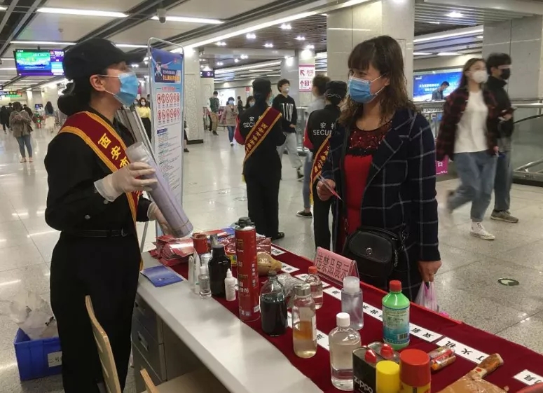 为深入贯彻落实习近平总书记的总体国家安全观,落实国家、省级、市级反恐办关于“切实增强全民国家安全意识,不断提高人民群众维护国家安全能力”为主要内容的反恐怖宣传教育,同时加强对疫情期间进站乘车人员的防护保障措施,保障所有出行乘客的人身及生命财产安全,按照西安轨道交通集团有限公司工作部署安排,结合“4·15全民国家安全教育日”和扫黑除恶宣传,贯彻落实分公司决定在全线网范围开展为期一周的反恐怖普法宣传教育活动和疫情防控相关知识宣传讲解,4月15日,西安市保安服务总公司、西安地铁运营分公司、公安地铁分局韦曲南派出所在西安地铁二号线小寨站,按照运营一中心下发的“关于反恐怖普法宣传教育活动计划”,开展违禁品展示宣传专项活动的通知”,联合开展“安全出行、共建平安和谐地铁”,“警民牵手110违禁品宣传”“2020年新冠疫情防控”等宣传教育活动。