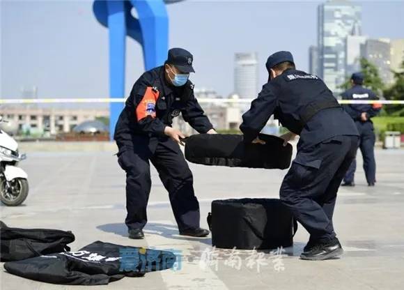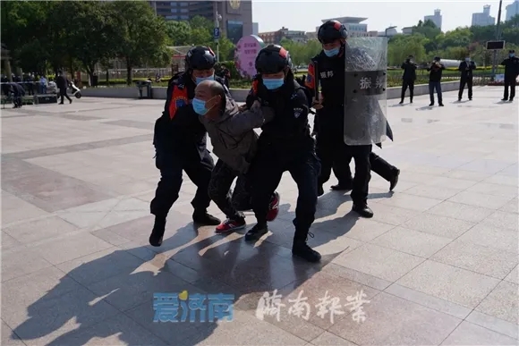 飒爽英姿的安保人员全副武装,整齐划一的队伍斗志昂扬,4月28日下午,一场立足“疫情防控与节日安全”的综合安保演练在泉城广场举行。