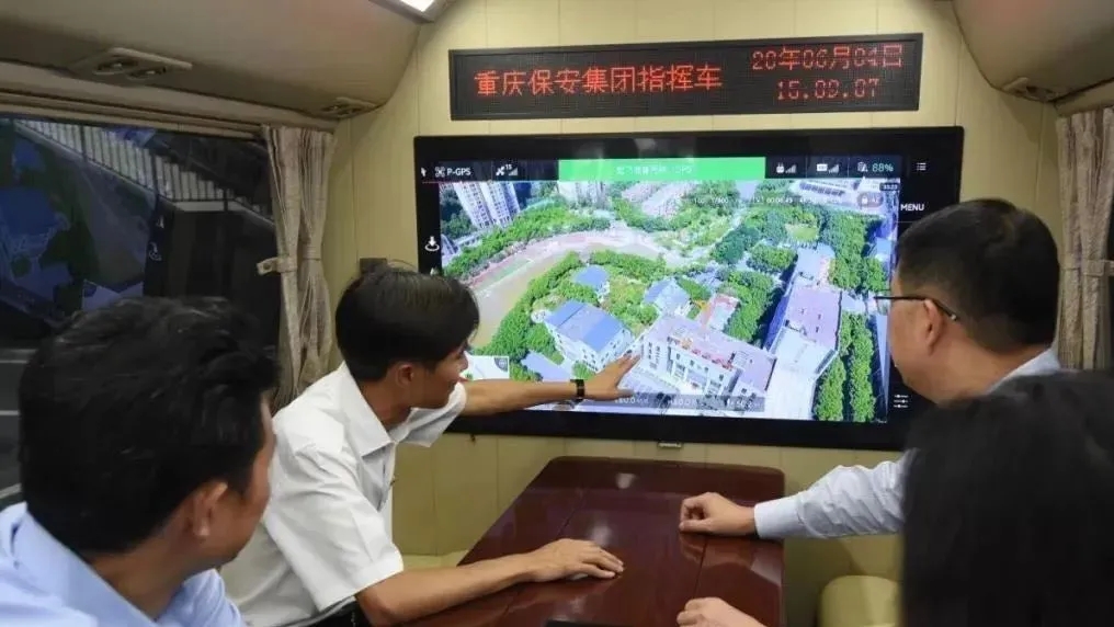 章勇武一行实地考察无人机勤务指挥车、金盾运钞车等安防设备设施,并与重庆保安集团领导班子进行座谈交流。