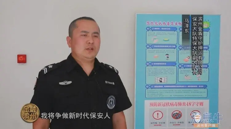 (滨州金盾守护押运有限公司保安大队特保大队副大队长 马泽东)荣誉既是鼓励,更是鞭策;荣誉不是终点,更是起点。作为90后的保安员,我将争做新时代保安人,时刻紧绷安全弦,不敢有丝毫松懈,以军事化的训练严格要求自己,努力把自己打造成一个形象良好,素质过硬、训练有素的新时代保安人。在平凡的保安岗位上,实现自己的人生价值。用自己的实际行动为保安这个行业增光添彩。据了解,疫情期间,滨州金盾守护押运有限公司共有600余名保安队员,放弃春节休假坚守在疫情防控第一线。应疫情需要出动车辆1000余次,发放防疫物资多批次。积极配合各级党委政府、公安机关、卫健、防疫、医院、交通等相关单位,排查车辆人员、对来往人员进行体温检测、协助相关单位做好消毒防疫工作,兢兢业业坚守在疫情防控最前沿。