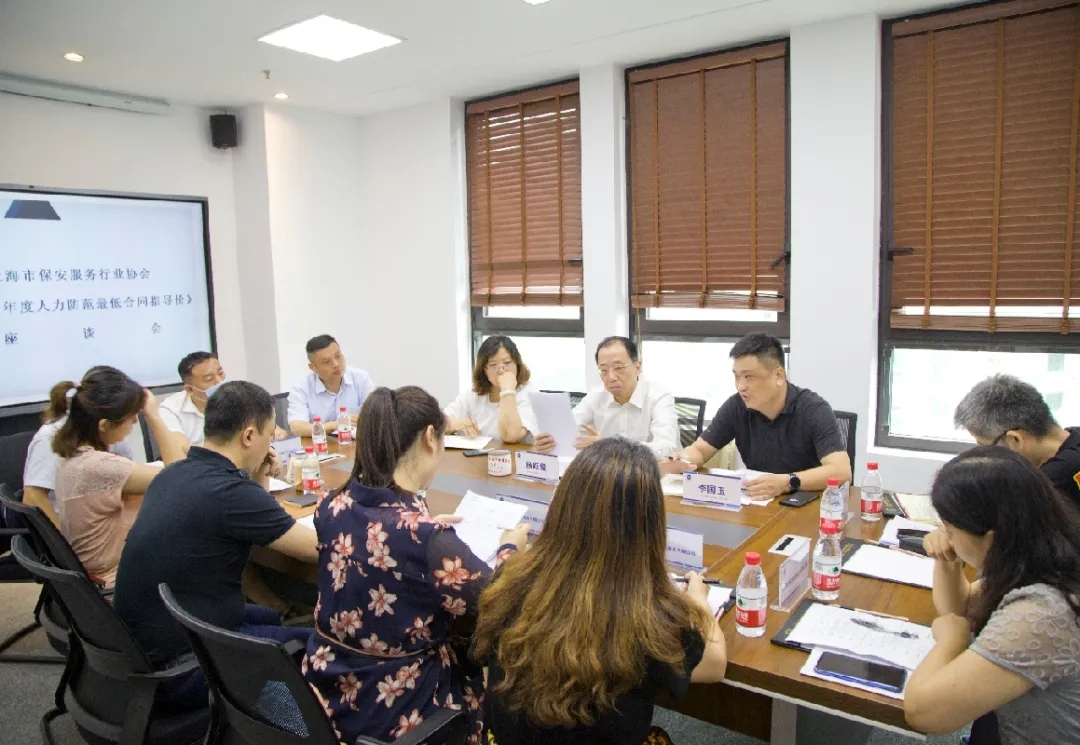 7月3日下午,上海市保安服务行业协会召集部分保安企业开展《年度人力防范最低合同指导价》调研座谈会。协会秘书长杨跃毅,办公室主任李国玉,行政部主任郑叶华及上海市保安服务(集团)有限公司、上海市浦东新区保安服务总公司、上海畅铭保安服务有限公司、上海赛夫保安服务有限公司、上海宗保保安服务有限公司、上海景鸿保安服务股份有限公司、上海诚信中宁保安服务有限公司、上海地久保安服务有限公司8家企业参加会议。