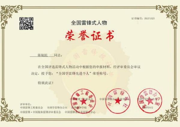 近期,江苏天名保安服务有限公司董事长陈镜民被中国雷锋工程委员会、中国雷锋报社、全国学雷锋办公室、中国雷锋报社美育研究中心、中国雷锋·中国集体雷锋评审委员会评审授予“全国学雷锋先进个人”荣誉称号。多年来,陈镜民带领公司不断创新发展,积极投身志愿服务,热心参与社会公益,特别是前期主动通过武汉红十字会向雷神山医院捐赠物资,助力疫情防控工作。