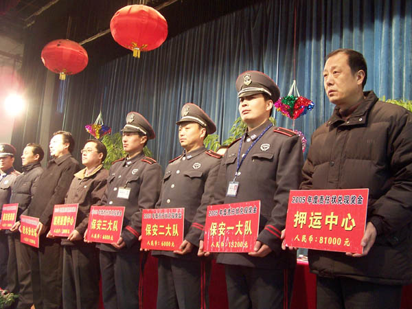 元月22日上午,总公司隆重召开“责任状兑现暨春节安保工作会议”,会议对完成2005年任务指标的9个部门受状人颁发了责任状奖金,并对春节安全保卫工作作了部署。武装押运中心、保安大队及各部门300余人参加了会议。