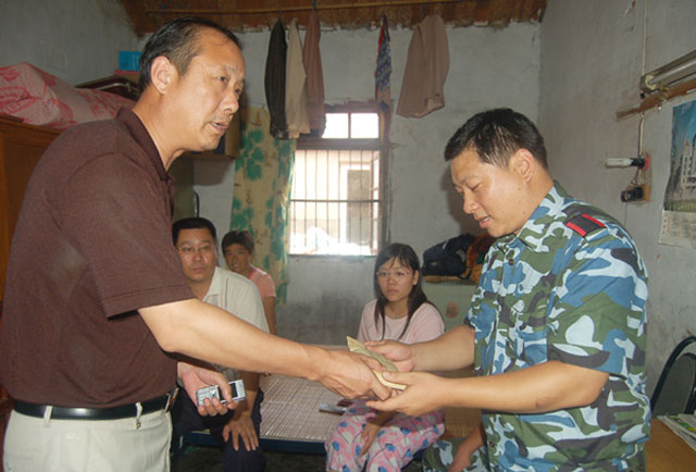 8月5日上午,总公司工会侯秀滨主席赴洪泽将5900元爱心款送到押运队员蒋士军手中,鼓励他和家属要战胜病魔、战胜困难。蒋士军是保安公司一名武装押运员,他家属不幸患上了尿毒症,每月高达4000多元的血透费用,对于家庭一直比较贫困的他来说,无疑是雪上加霜。保安公司了解到他的实际困难后,立即在押运队伍中组织对他进行爱心捐款,受到了押运员的积极响应。