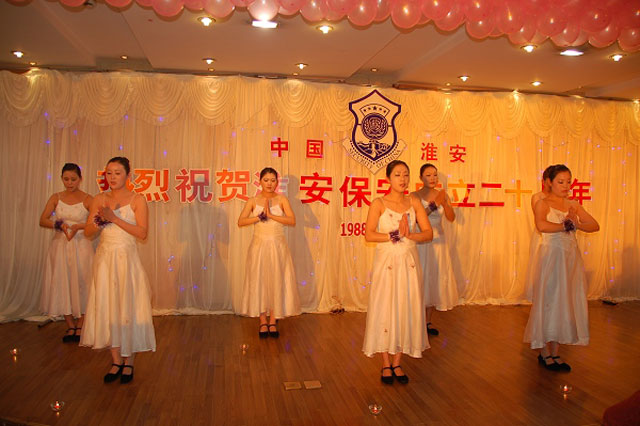 感恩父母,给了我们生命;感恩公司,给了我们成长;其实,此时此刻最感恩的是我们的淮安保安大家庭。随着灯光暗下,现场响起《感恩的心》的旋律,7名天地缘大酒店的女员工手捧心形蜡烛从会场缓缓走向舞台,开场舞蹈《感恩的心》拉开了庆典晚会的序幕。在点点烛光中,女员工们用手语诠释着歌曲的深意,饱含温情。下面的节目是押运员周军带来的吉它伴唱《丁香花》、保安员姜浪带来的巴乌独奏《月光下的凤尾竹》、银盾物管公司杨生带来的歌曲《北国之春》。