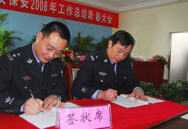 年度工作总结表彰大会上,娄伯翱总经理与保安部、押运中心、技术防范部等