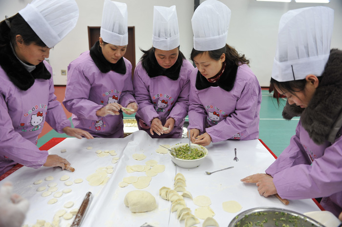 早晨9点钟,每位选手都戴上了厨师帽、穿上了色彩鲜艳的围裙,为比赛增添了一道靓丽的风景。每支队伍举着自己的宣传牌,伴随着激昂的口号,步入了活动中心,每支队伍看起来都气势非凡。随着裁判员的一声令下,比赛正式开始,四支队伍展开了紧张的比拼。队员们开始揉面、擀皮、包饺子,动作娴熟、有条不紊。从和面开始,大家密切分工,团结合作,你和面来,我加水,你擀皮来,我包饺,争分夺秒,忙得不亦乐乎。现场各队的加油声、欢笑声和餐具的碰撞声交织成一曲欢快的交响乐…….转眼间,包好的饺子就挤满了桌面。数量是有了,还要看质量和口味。