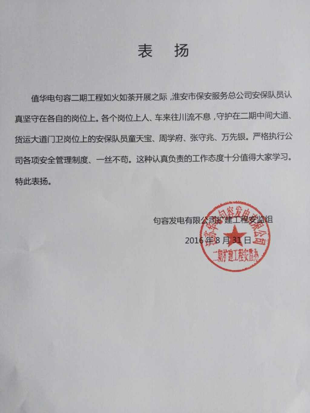 2016年8月31日,淮安保安驻外分公司收到江苏华电句容发电有限公司发来的表扬信。表扬淮安保安驻句容执勤点的四名保安队员童天保、周学府、张守兆、万先银认真坚守各自岗位、严格执行服务单位各项安全管理的行为。