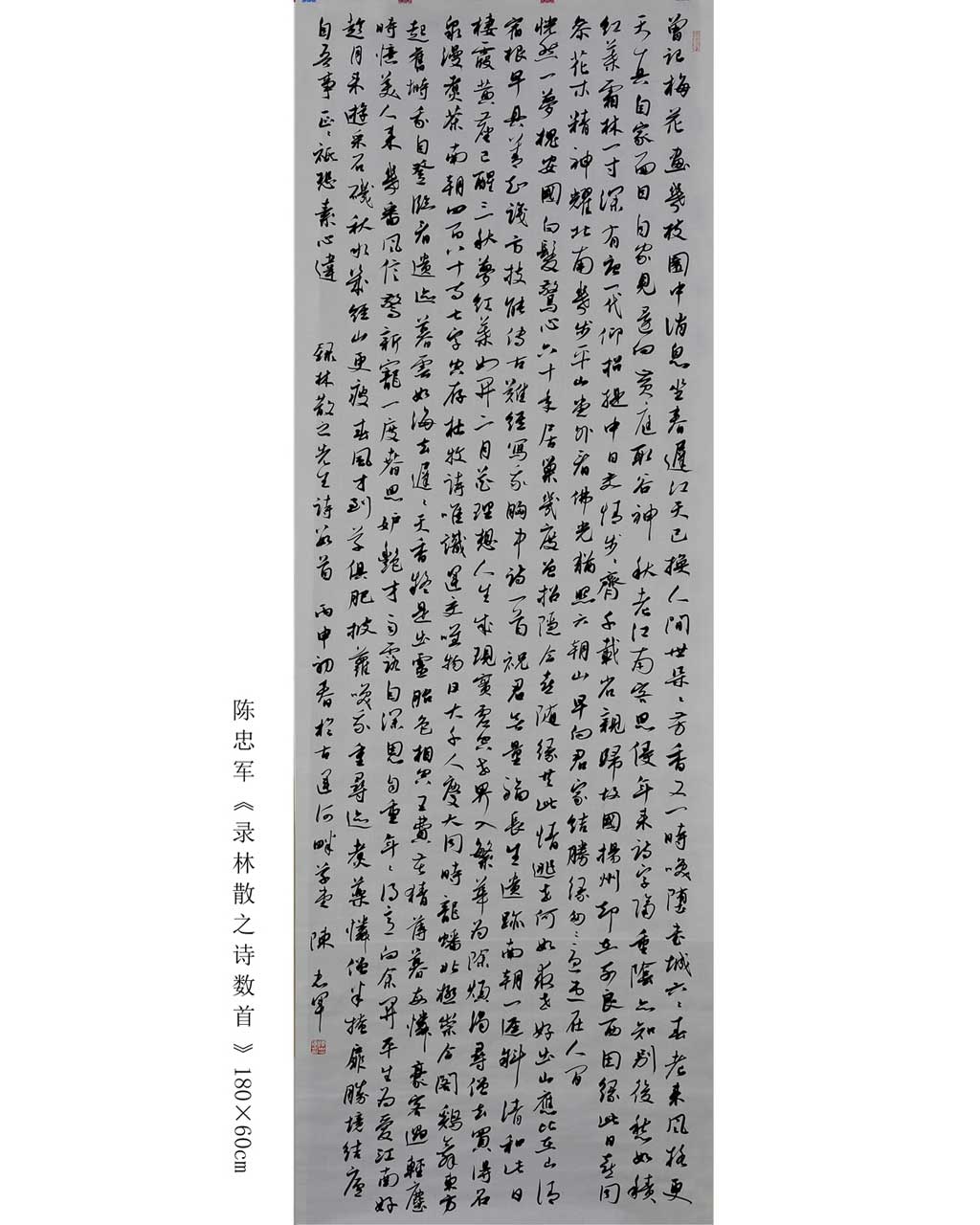 近日,由文化部、陕西省人民政府主办的第十一届中国艺术节书法篆刻作品展览参展作者名单揭晓,经过初评和终评,总公司陈忠军书法作品《录林散之先生诗数首》入选该展览。