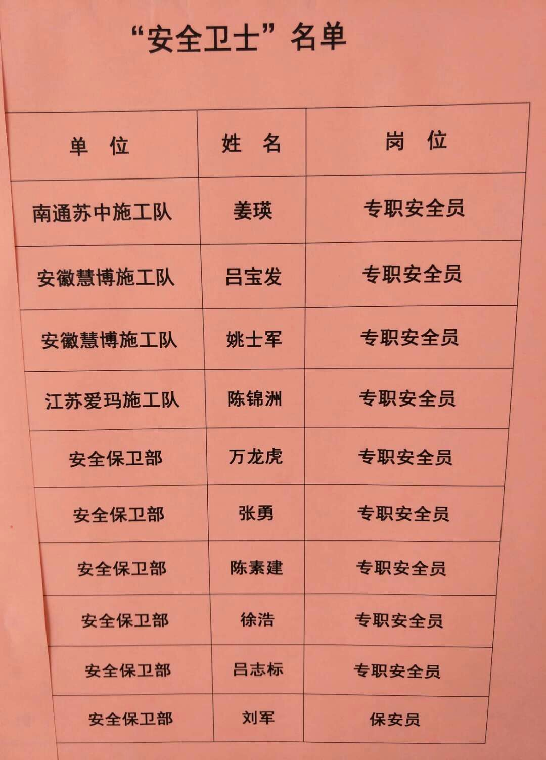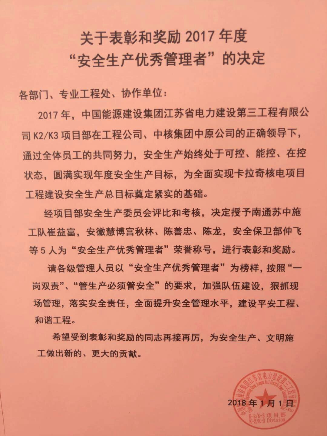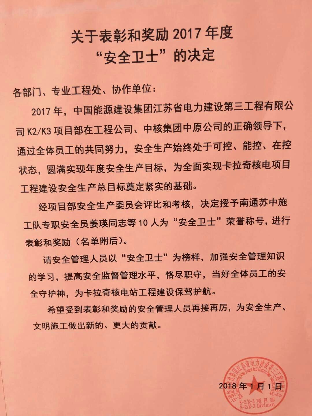 2018年第一天,总公司驻巴基斯坦卡拉奇执勤点保安员受到中国能源建设集团江苏省电力建设第三工程有限公司K2/K3项目部的表彰和奖励,仲飞荣获“安全生产优秀管理者”称号;万龙虎、张勇、陈素建、徐浩、吕志标、刘军等6名安全员荣获“安全卫士”称号。