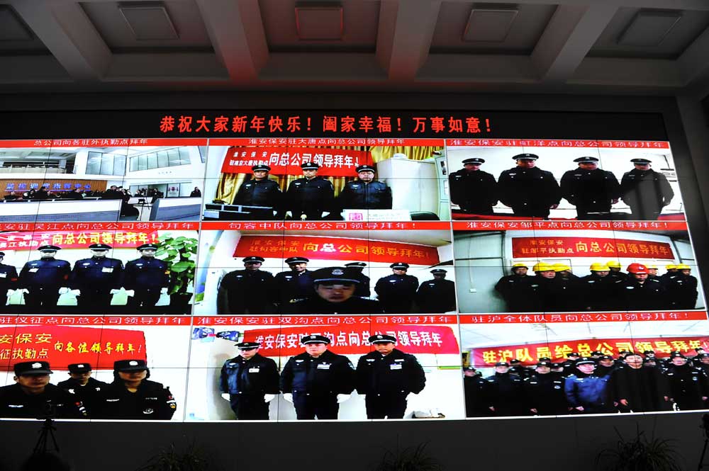 随后,公司领导来到总公司监控指挥调度中心,通过互联网视频联线慰问了总公司驻上海、苏州、南京、连云港等地坚守岗位的保安员。