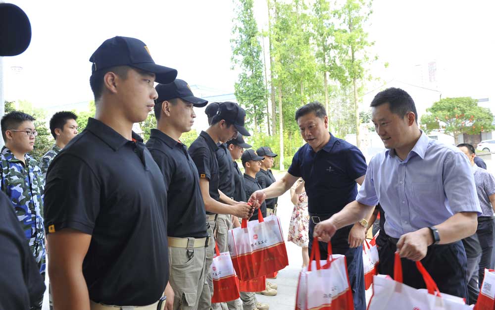 8月8日下午,淮安市总工会和市公安局工会等领导一行来到总公司,在公司娄伯翱总经理陪同下,亲切看望和慰问了正在训练中的押运新队员和犬防大队、安保中专班等员工,并将防暑物品送到他们手中,表达对奋战在安保一线的保安队伍的敬意,并勉励大家立足本职,再接再厉,进一步为淮安经济建设保驾护航。 娄伯翱总经理代表全体员工对工会领导深入总公司专程慰问表示感谢,并表示保安队伍要继续发扬敬业奉献精神,为“平安淮安”建设做出更大贡献。