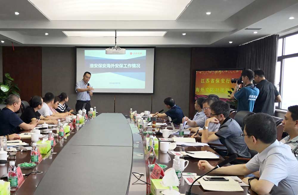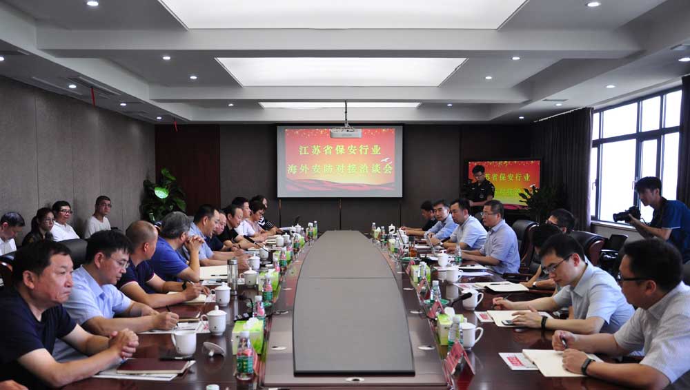 2018年8月7日上午,江苏省保安协会邀请江苏省商务厅、江苏海外企业集团有限公司、江泰联盟有关主管部门,组织淮安市保安服务总公司、南京市保安服务总公司、徐州精诚特卫保安服务有限公司、江苏英杰保安服务有限公司、江苏世安保安服务有限公司、苏州营财保安服务股份有限公司、云之约安全服务(江苏)有限公司等重点企业,在淮安市召开了江苏省保安行业海外安防对接洽谈会,建立了全省保安行业海外安防协作交流机制。