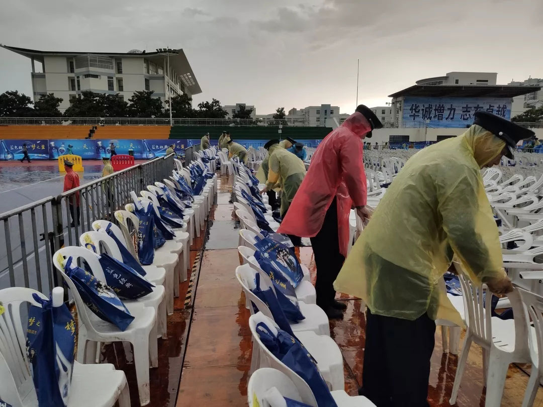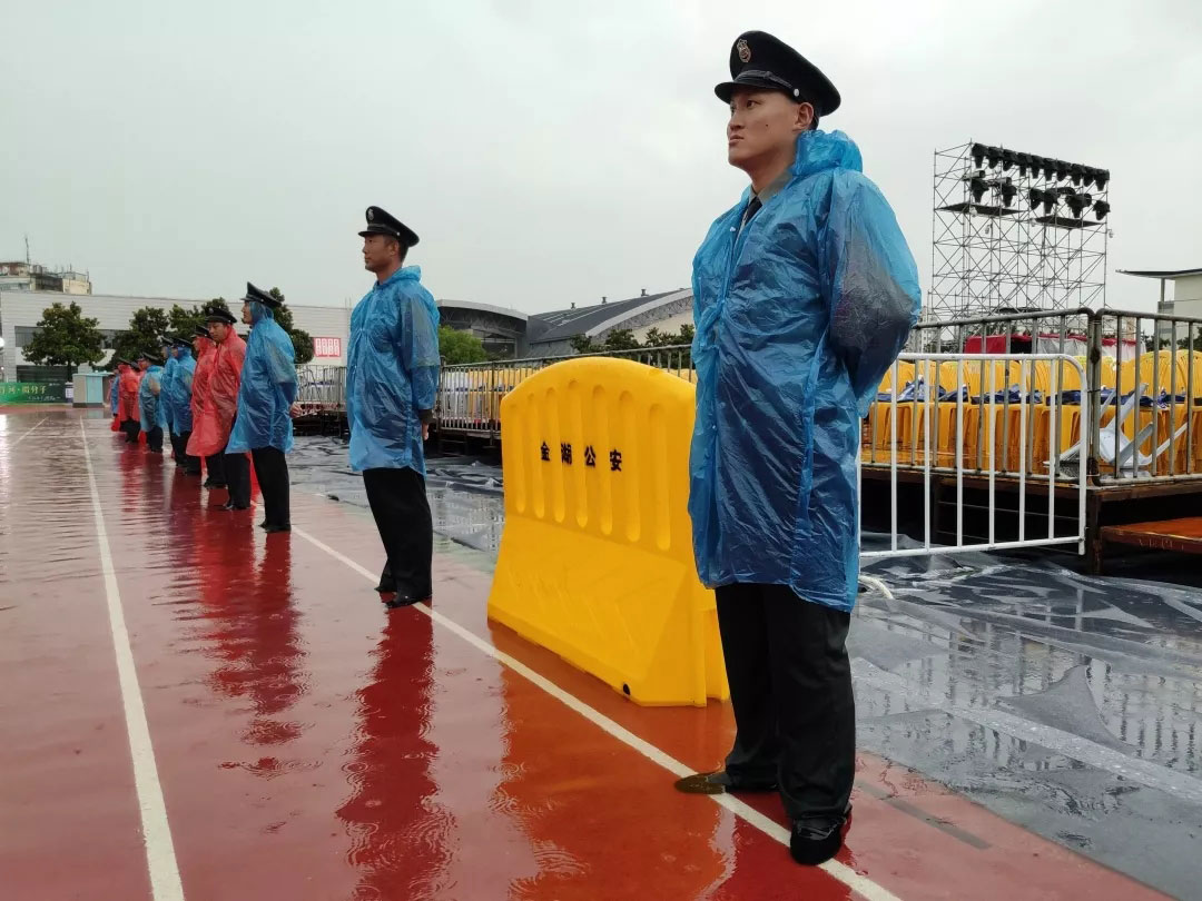 7月6日下午15点,晚会现场暴雨来临,降雨量已超100毫米,雨势持续,并伴有雷暴天气。由于恶劣天气影响,加上持续暴雨,部分道路积水严重,给观众入场带来安全隐患。总公司立即启动灾害天气应急预案,行政部门迅速出动,发放雨衣。人防管理中心组织全体保安队员,在重要路口指挥疏导,采取定人、定岗、定责的预防措施,全体保安队员在暴雨中坚守岗位,认真做好岗位工作。
