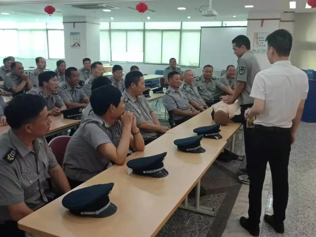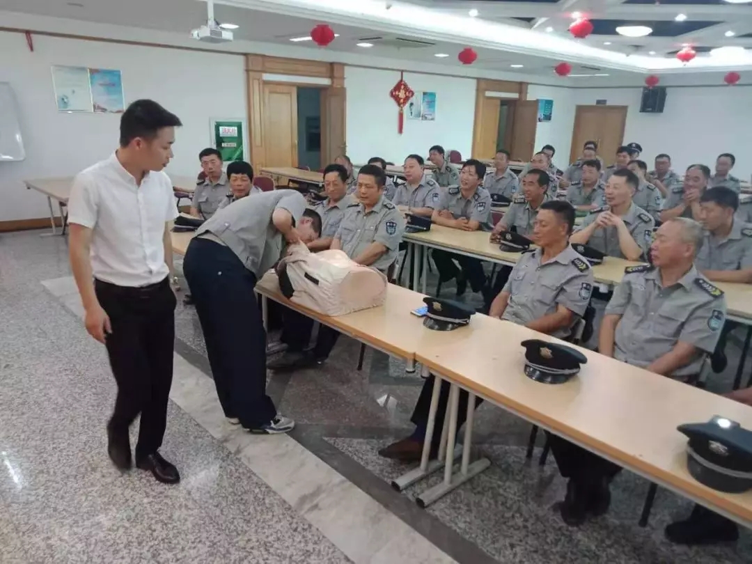 孙老师详细讲解了突发事件现场处理中,人工呼吸、胸外按压的方法与步骤,并挑选骨干现场互动演示。在活动过程中,孙老师针对保安员的年龄结构及职业性质,详细分析讲授了常见职业病的预防和改善、慢性疾病的预防、心理健康知识和中医养生知识。