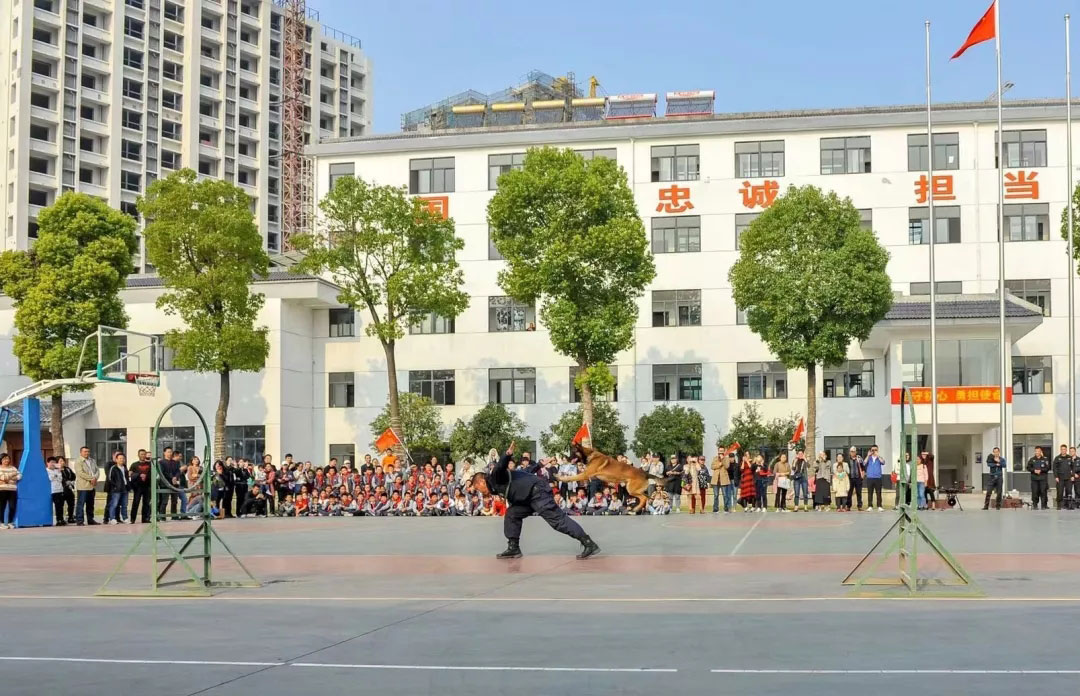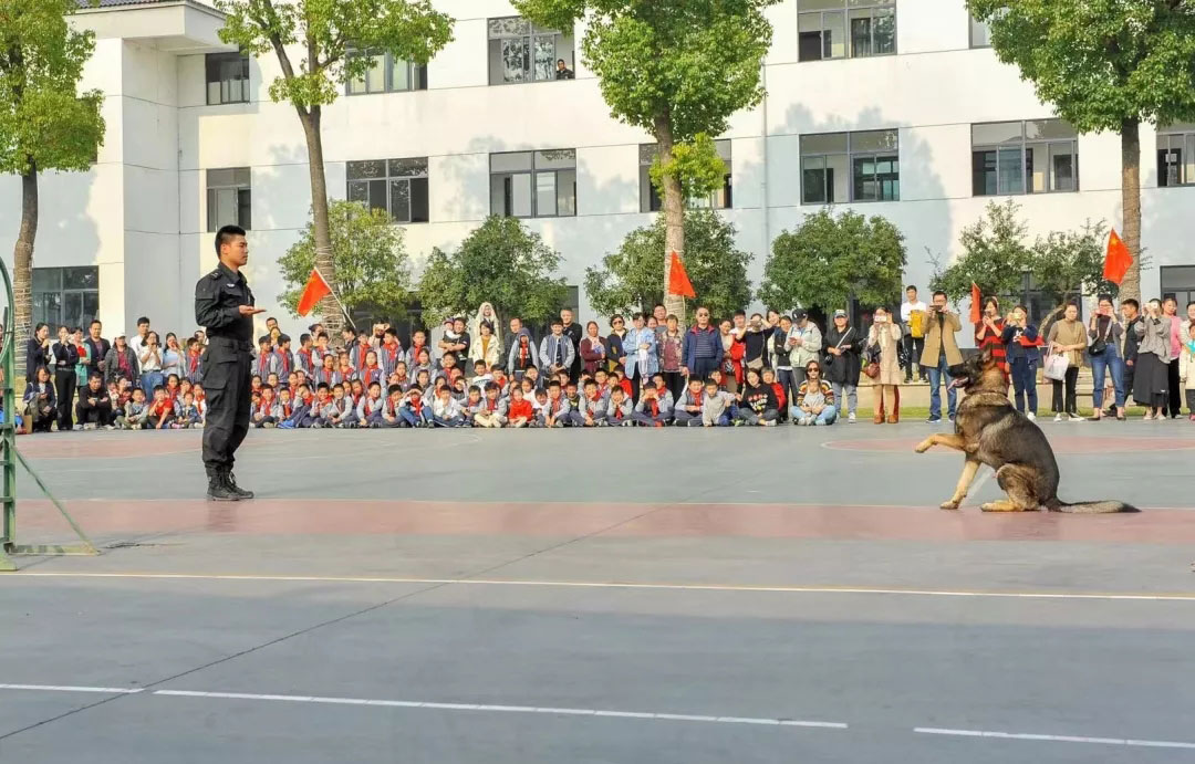 在警犬训练基地,训导员向学生们讲解了警犬在搜救工作中发挥的重要作用。随后精彩的警犬训练表演把活动推向了高潮:警犬在训导员的口令下,迅速准确地做出相应的基本动作和匍匐、后退、站立、跳跃等花式动作,还模拟了犯罪嫌疑人劫持人质,队员果断给警犬下达口令,接到口令的警犬犹如出膛的子弹,瞄准该男子的右手飞扑着咬去,当场控制了“犯罪分子”,解救了人质。在场学生目不转睛、连连欢呼。