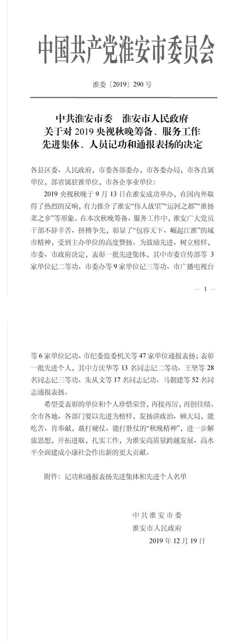 日前,淮安市委市政府发文对2019央视秋晚筹备和服务工作中涌现出来的先进集体和先进个人进行通报表扬,总公司获先进集体,王广卫同志获先进个人,并被通报表扬。今年9月在淮安举办的央视中秋晚会,举国关注,举世瞩目,淮安保安讲政治、讲大局,举全公司之力,集全公司之智,众志成城、戮力同心、创新举措、压实责任,自8月9日起至10月9日,从晚会设备进场、舞台搭建、彩排联排、录播直播直至设备拆除,累计投入安保力量8000余人次,各类高科技安保装备20余种,保障车辆580余辆次,圆满完成了巡逻守护、安全检查、科技保障、搜毒搜爆、无人机管控、后勤保障等系列任务,充分发挥了保安队伍担当勇为、攻坚克难、敢打必胜的拼搏精神,确保了央视秋晚的成功举办,得到了央视导演组、组委会的充分肯定和市委市政府的高度好评,企业品牌形象得到了进一步提升!
