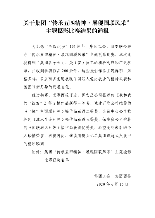 为纪念“五四运动”101周年,国联集团工会、团委联合举办“传承五四精神·展现国联风采”主题摄影比赛。保安总公司选送胡伟芳和李晋戎的作品《我和我的“战友”》等2幅作品,以鲜明的主题、多样的风格,从多层面多角度展现了犬防队员爱岗敬业的风貌和淮保人行稳致远的精神,获得了本次摄影大赛的一等奖。