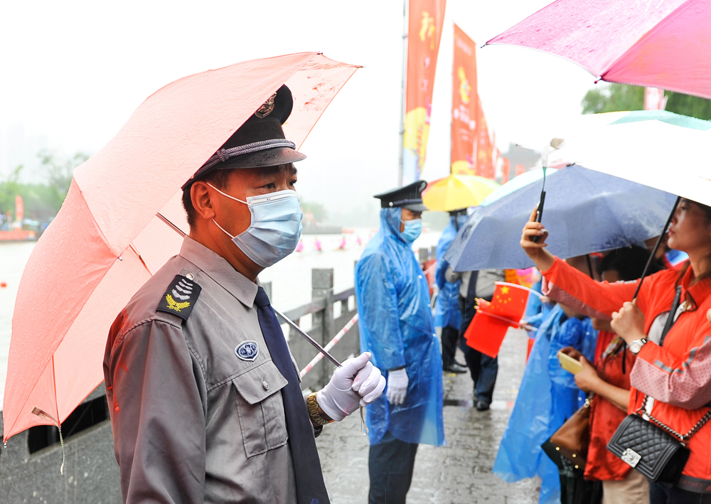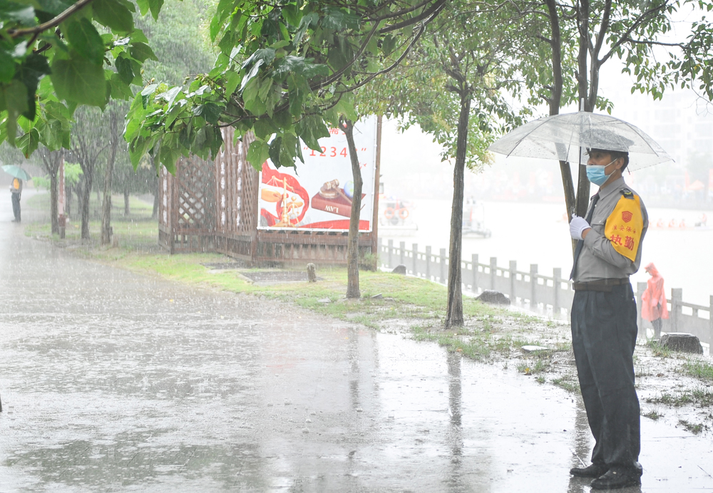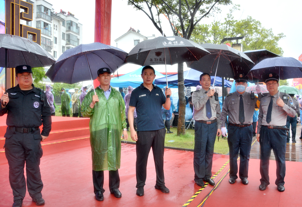23日清晨6时,总公司抽调600余名保安人员按照方案提前布岗到位,在风雨中形成一道坚实的人形屏障风景线。面对肆虐的风雨,执行现场安保任务的队员们始终坚守在岗位上,有序开展安全检查、体温检测、沿途守护、维持赛场秩序,一方面继续抓牢抓实疫情防控,一方面认真做好各项安保工作,精心保障赛事活动安全、有序开展。