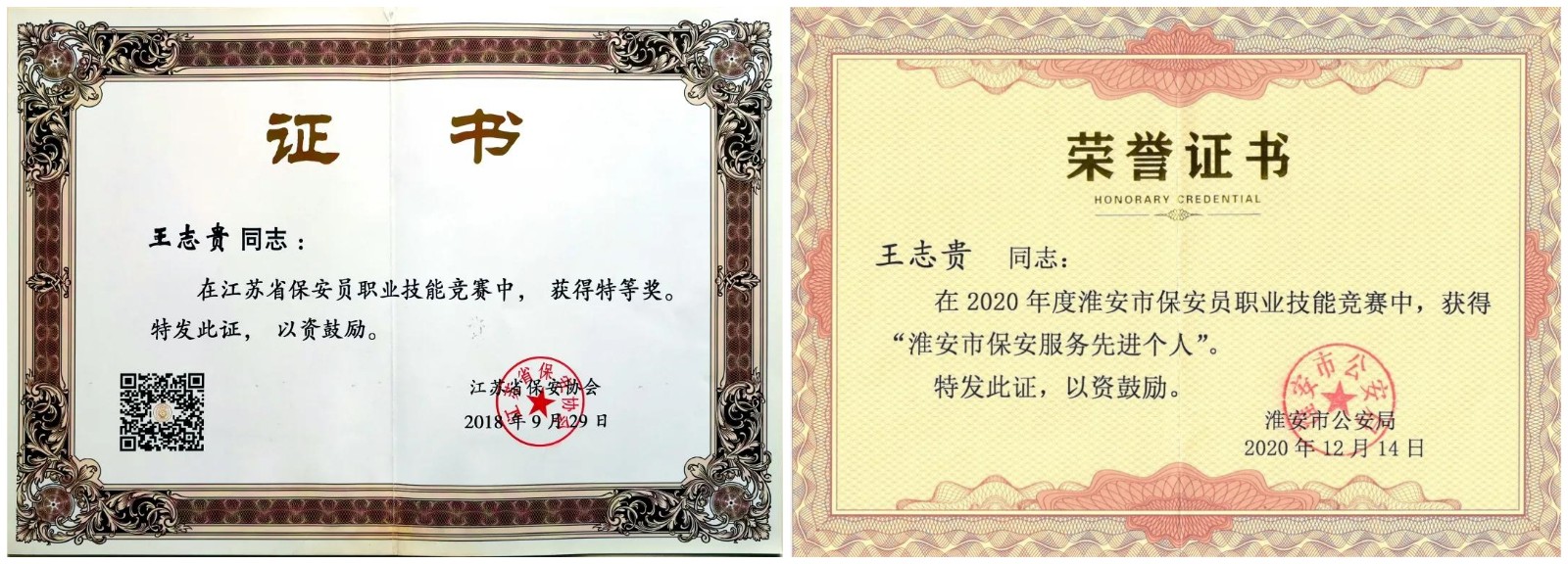 押运车长王志贵同志,本科学历,中共党员,保安员国家职业技能等级二级,保安技师资格证。工作十几年来,他始终保持军人本色,服从命令,听从指挥,爱岗敬业,不断挖掘自己的内在潜能,多次参加省、市保安职业技能大赛,先后荣获省、市数次奖项:2018年度,在江苏省保安职业技能竞赛中,获得“特等奖”,被授予“江苏省技术能手称号”,被总公司评为“十佳保安”;2019年度,被总公司评为“优秀车长”、“押运红旗车组”;2020年度,被授予“江苏省技术能手”、“江苏省五一创新能手”、“江苏省青年岗位能手”、“淮安市青年岗位能手”、“淮安市技术能手”、“淮安市五一创新能手” 等荣誉称号,被淮安市公安局评为“淮安市保安服务先进个人”。